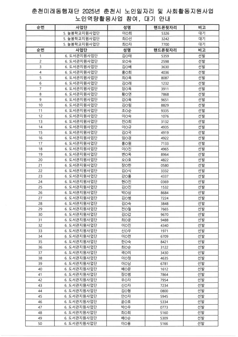 2025년 춘천미래동행재단 노인일자리 및 사회활동지원사업 참여, 대기 결과 공고 |