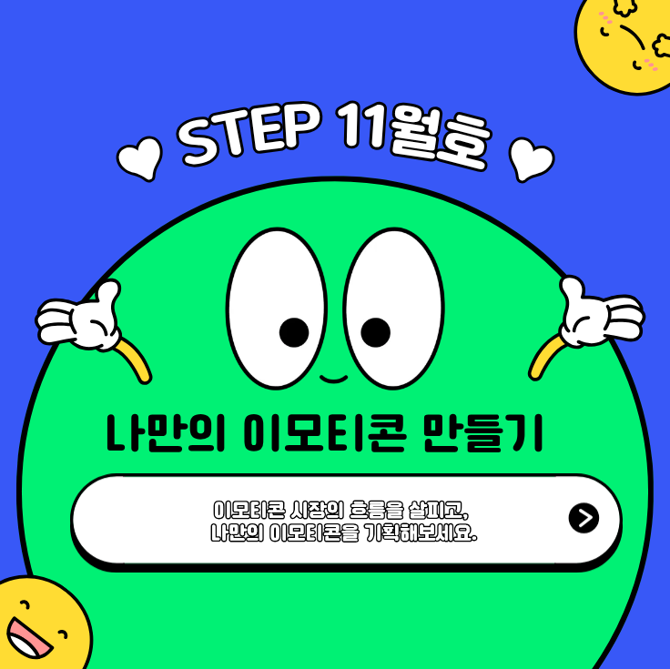 11월 STEP 안내 페이지 정보 작성자 미래준비사업부3 작성일 2025.10.30 00:00 분류 안내 170 조회 글버튼 수정하기 삭제하기 목록 본문 [강의목차]1. 이모티콘 기획하기2. 이모티콘 캐릭터 만들기3. 이모티콘 텍스트 및 그림 그리기4. 이모티콘 제안하기강의링크 : https://cc5070.step.or.kr/main.do SNS 공유 신고 차단 이전글 다음글 글버튼 수정하기 삭제하기 목록