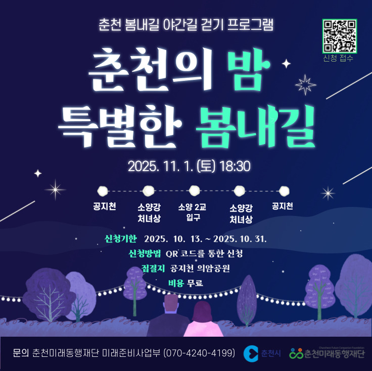 봄내길 야간길 걷기 프로그램 안내 페이지 정보 작성자 미래준비사업부3 작성일 2025.10.31 00:00 분류 안내 152 조회 글버튼 수정하기 삭제하기 목록 본문 - SNS 공유 신고 차단 다음글 글버튼 수정하기 삭제하기 목록