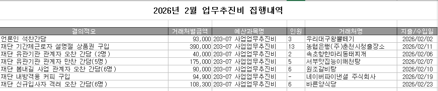 2026년 2월 업무추진비 집행내역 페이지 정보 작성자 사무국2 작성일 04.01 00:00 3 조회 글버튼 수정하기 삭제하기 목록 본문 2026년 2월 업무추진비 집행내역 SNS 공유 신고 차단 이전글 다음글 글버튼 수정하기 삭제하기 목록