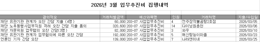 2026년 3월 업무추진비 집행내역 페이지 정보 작성자 사무국2 작성일 04.01 00:00 3 조회 글버튼 수정하기 삭제하기 목록 본문 2026년 3월 업무추진비 집행내역 SNS 공유 신고 차단 다음글 글버튼 수정하기 삭제하기 목록